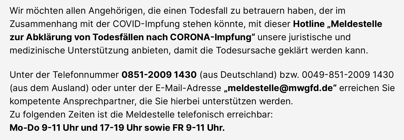 - Hotline / Meldemöglichkeit / Obduktionsmöglichkeit / Kooperation mit MDWFG (Mediziner und Wissenschaftler für Gesundheit, Freiheit und Demokratie e.V.)