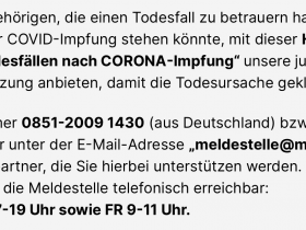 Wir möchten allen Angehörigen, die einen Todesfall zu betrauern haben, der im Zusammenhang mit der Covid-Impfung stehen könnte, mit dieser Hotline "Meldestelle zur Abklärung von Todesfällen nach CORONA-Impfung" unsere juristische und medizinische Unterstützung anbieten, damit die Todesursache geklärt werden kann.