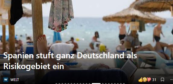 • Für alle Besucher aus Deutschland wird die Einreise nach Spanien erschwert. Ab dem 23. August wird ganz Deutschland aufgrund der steigenden Infektionszahlen zum Risikogebiet erklärt, teilte das spanische Gesundheitsministerium in Madrid mit.
