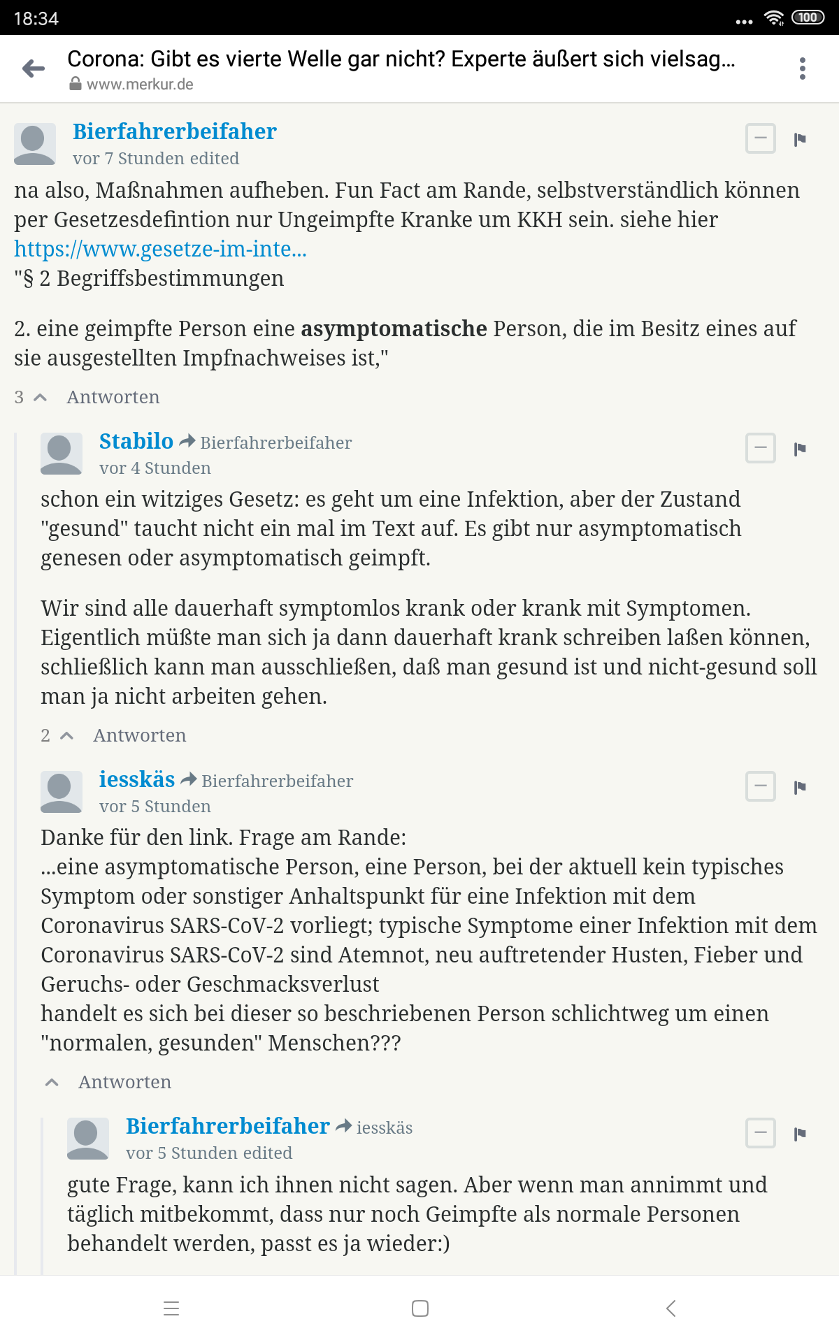 nun noch eine schöne Geschichte aus dem prallen Leben. Habe heute eine Eigentümerversammlung beiwohnen müssen, in der ich noch einige Wohnungen halte (die fliegen bald alle aus dem Portfolio). War eine 3-G-Veranstaltung. Ich habe als einziger die ganze Zeit mit Absicht als Statement (Erkennungsmerkmal Ungeimpfte) eine FFP3-Maske aufgehabt (bei über 3 Stunden Dauer nicht ganz angenehm).