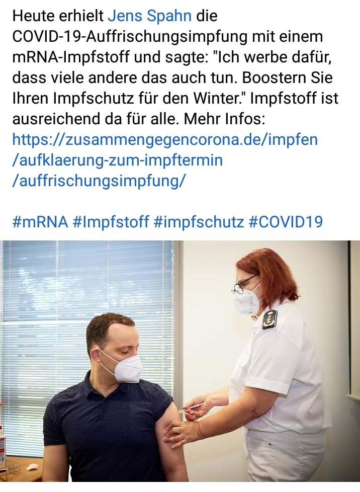 Spahn wurde heute das 3. mal Geimpft. Geboostert sozusagen. Klar, er muss ja als Vorbild vorangehen.