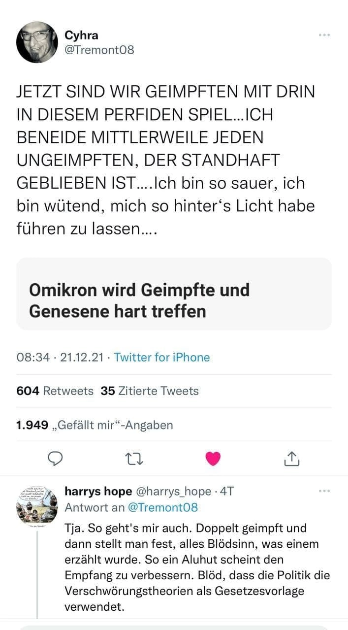 Ich bin schon froh, dass er die mRNA Brühe nicht im Körper hat. Novavax oder Valneva (oder das in Tübingen in der Entwicklung stehende Verfahren) werden das weitaus kleinere Übel sein.