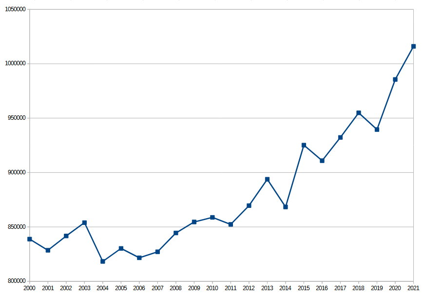 Stimmt aber nicht, 2016 waren 910 Tausend, 2019 (vor Corona) 939 Tausend, jetzt werden es über 1 Million sein.