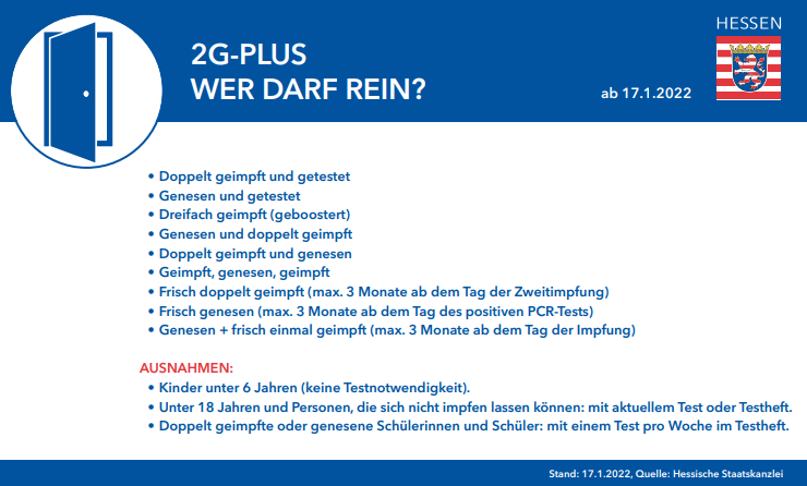 Auf der Seite des Landes Hessen wurde eine Übersicht eingestellt, auf der aufgeführt ist, was in Hessen seit dem 17.01.2022 unter 2G+ zu verstehen ist (also nach dem das RKI den Genesenenstatus von sechs auf drei Monate verkürzt hat).