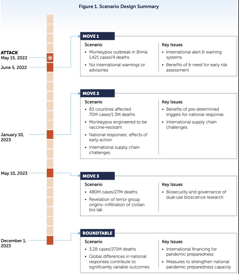 Das Szenario basiert auf einem genetisch veränderten Affenpockenstamm, der gegen Pockenimpfstoffe resistent sein soll. Das Virus soll von Terroristen freigesetzt worden sein – und zwar ausgerechnet im Mai 2022: