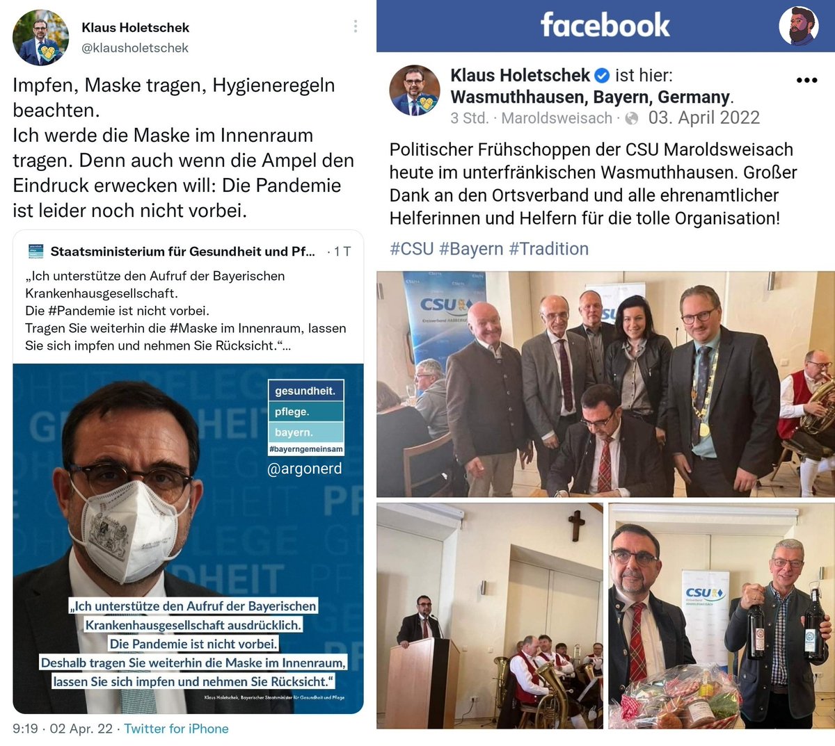 Für diesen Tweet erhielt er einerseits Kritik, andererseits Spott und Häme, da der Gesundheitsminister schon einen Tag später auf seinem Facebook-Profil, Fotos eines geselligen "Politischen Frühschoppens" präsentierte. Auf allen Fotos seiner Treffen mit weiteren Teilnehmern in Innenräumen war keine einzige Maske zu sehen.