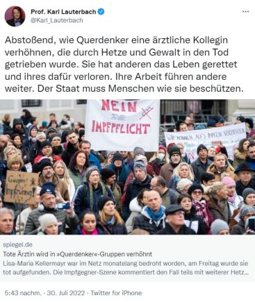 • Der Name Karl Lauterbach ist so ein richtiges No-GO geworden, bei fast jedem Gespräch wo man ihn erwähnt, sackt die Laune schlagartig einige Sekunden brutal in den Keller. Der ist wie ein getriggerter Tinnitus bei Erwähnung.