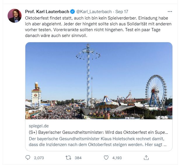 Gestern bei SternTV haben sie einen Clip vom ehemalgem Corona Hardliner Söder gezeigt wo er gefragt wurde ob so ein riesen Fest trotz Corona ok ist. Da hat er geantwortet: "Leute die Angst vor Corona haben, sollen halt einfach Zuhause bleiben."