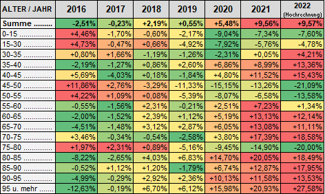 ... 2020-2022 in den älteren Altersgruppen stärker gestorben wurde als in den Vorjahren (bis auf die wieder robusteren rund um das Baujahr 1945).