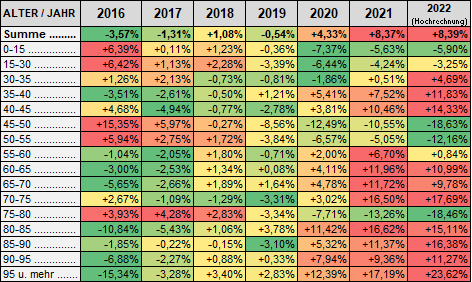 Was ich allerdings recht interessant finde, sind die Geburtsjahrgänge rund um 1945 im Vergleich zu denen rund um 1940. Die 1940er sind 2016-2018 relativ stark im ableben, während die 1945er 2019-2022 relativ stark im überleben sind.