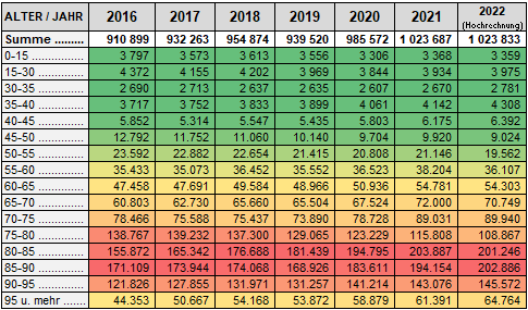 ... 2020-2022 in den älteren Altersgruppen stärker gestorben wurde als in den Vorjahren (bis auf die wieder robusteren rund um das Baujahr 1945).