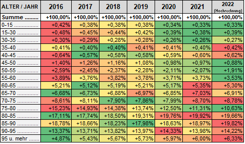 ... wenn man aber nun den Prozentualen Anteil pro Altersgruppe pro Jahr ermittelt und wieder von links nach rechts einfärbt, so erkennt man, dass ...
