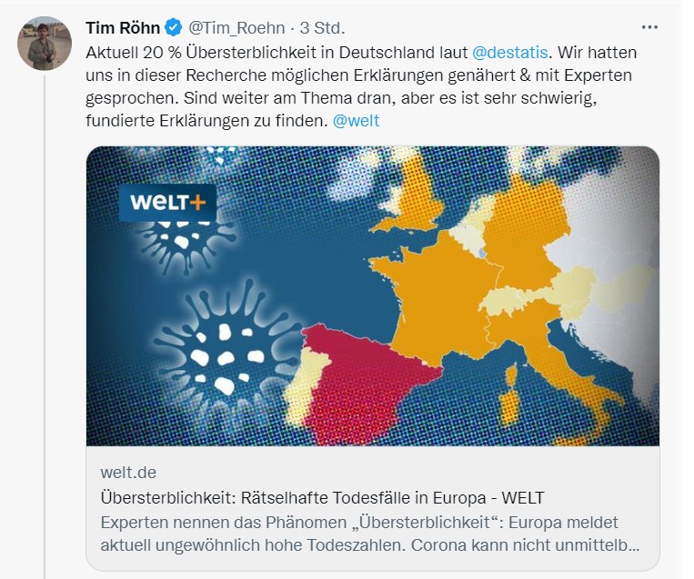 Allerdings möchte ich betonen dass Schweden eine niedrigere Übersterblichkeit hat, also kann die Impfung niemals alleine die Ursache sein. Einschränkungen, Isolation, Depressionen, Maskenpflicht, Bewegungsmangel usw. müssen da mit reinspielen. Eben eine Kombination aus allen Maßnahmen und Injektionen.