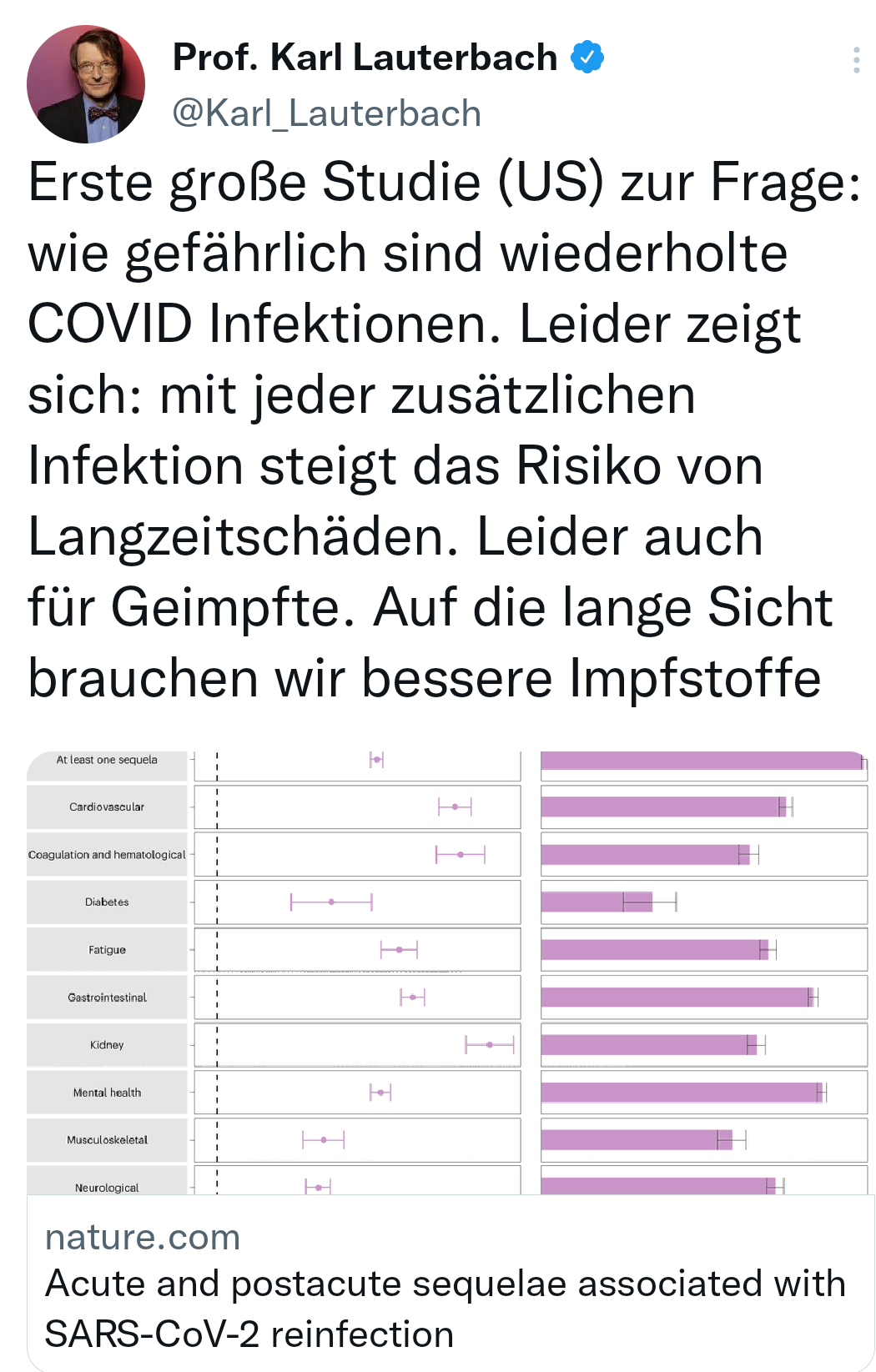 wieder eine Bestätigung, dass das angebliche Long-Covid eigentlich Impfschäden sind! "Schön" ist auch wieder einmal das Foto nebst Überschrift: Die Impfschäden sind weniger schädlich, als eine Covid19-Erkrankung.