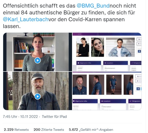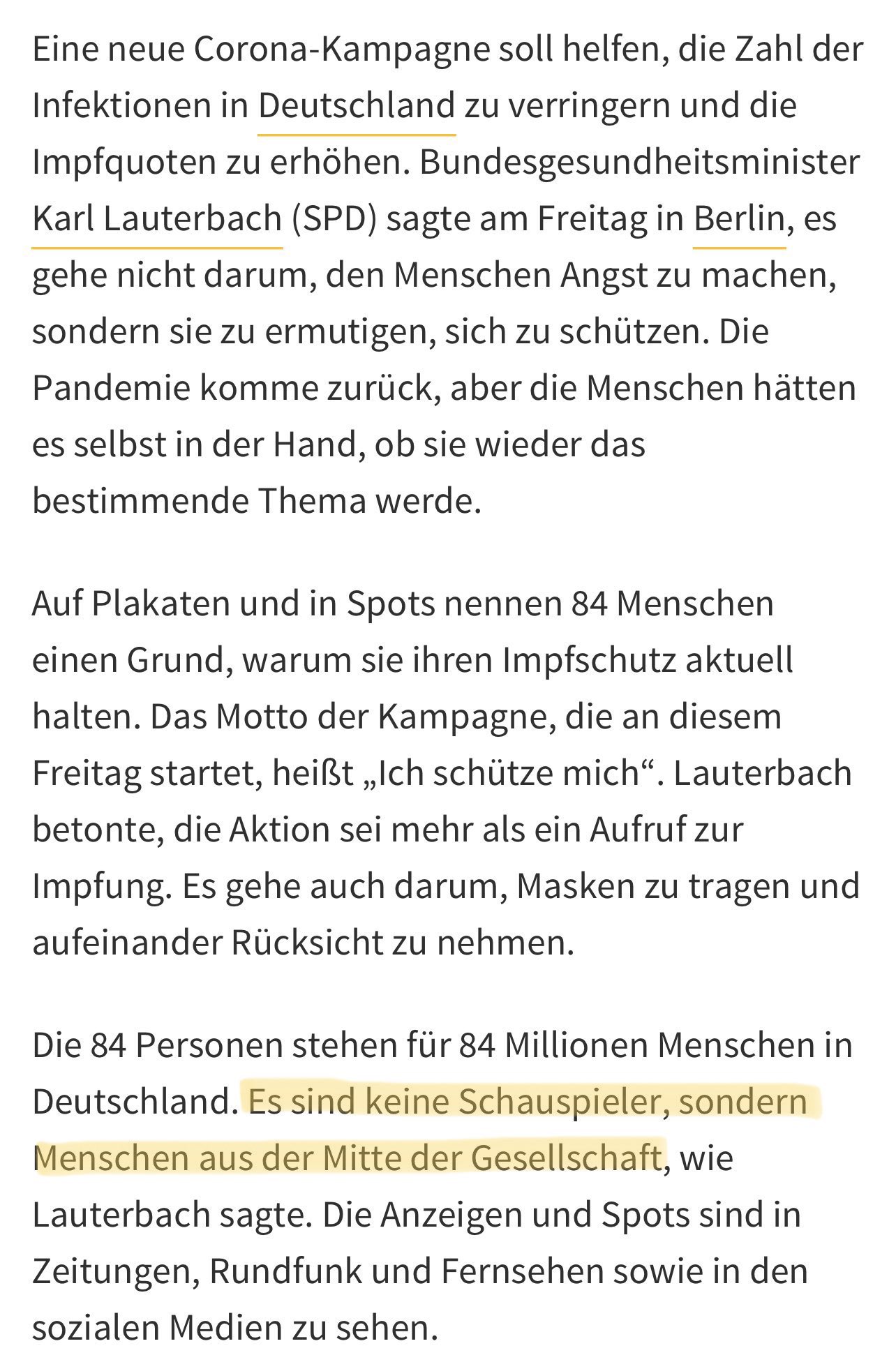 Lauterbach verarscht die Bürger weiter, indem er Schauspieler als ganz normale Bürger (z.B. Lehrer) ausgibt, die sich impfen lassen. Aber ich glaube fast, Lauterbach schätzt das ganz richtig ein: Gibt genug, die wollen geradezu verarscht werden.