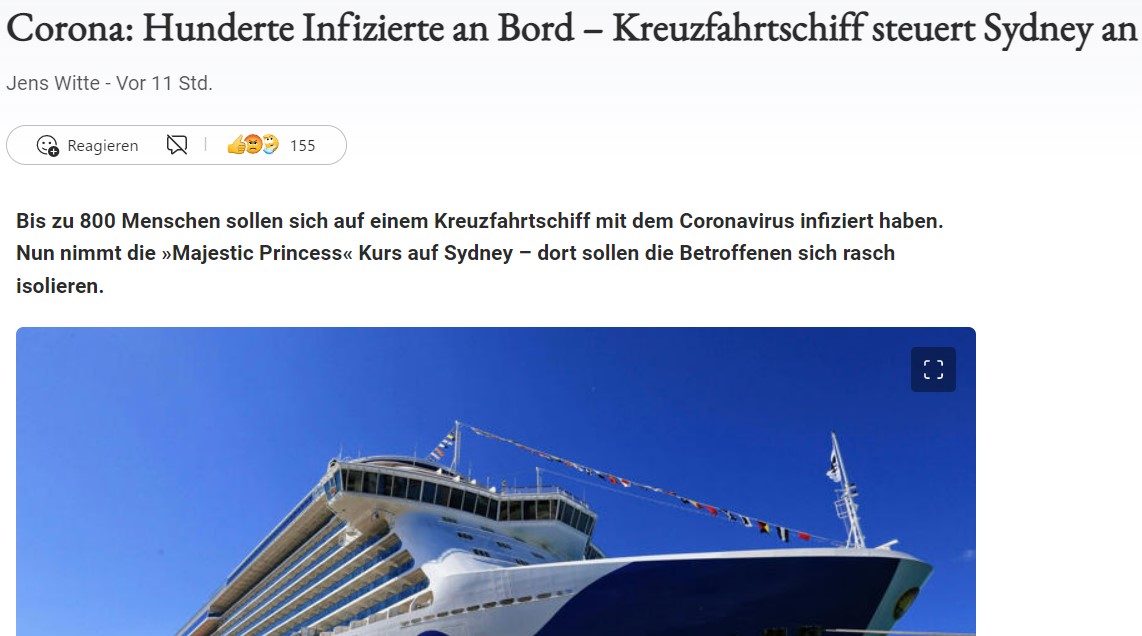 • Der Luxusliner soll am frühen Samstagmorgen (Ortszeit) in Sydney anlegen. Auf dem Schiff befinden sich Angaben von 9News zufolge etwa 4600 Menschen. Für die infizierten Menschen seien in Sydney private Transportmittel organisiert worden, damit sie sich schnell isolieren könnten, hieß es.