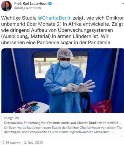 • Eine Pandemie in der Pandemie! [smilie_happy] Er ist einfach am Zenit der Panikmache angekommen. Afrika ist aber ohne größere Maßnahmen gut damit gefahren oder was sagte noch die südafrikanische Gesundheitsministerin betreffend Omikron ?