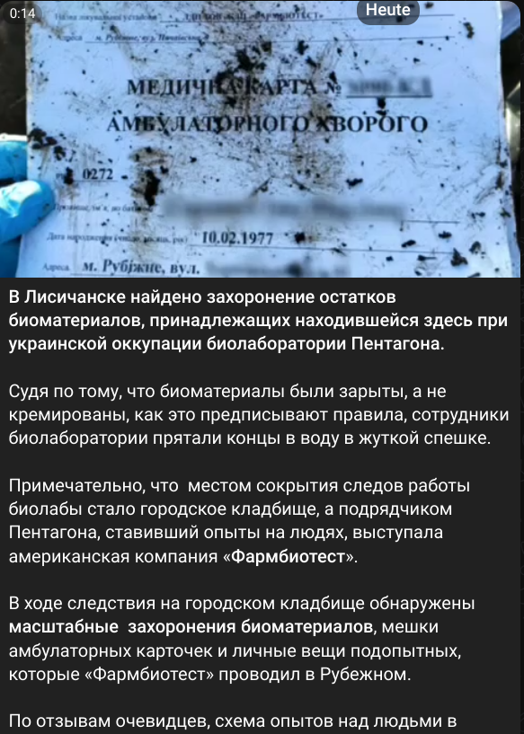 Bei der Untersuchung wurden auf dem städtischen Friedhof in Rubizhne groß angelegte Vergrabungen von Biomaterialien, Säcken mit Ambulanzkarten und persönlichen Gegenständen von Versuchspersonen durch Pharmbiotest aufgedeckt.