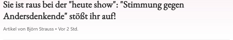 Moin,besser spät, als nie. Immerhin hat diese Schauspielerin den Schneid, die Fehler einzugestehen und die richtigen Konsequenzen zu ziehen. Ich habe ja die letzten 15 Jahre kein Fernsehen mehr geschaut, dieser Oliver Welke ist mir jedoch die ganze Corona-Zeit extrem negativ aufgefallen! Er ist für mich wirklich ein Regierungs-Hetzer, wie er im Propaganda-Leitfaden als Ideal beschrieben ist. Ein ganz schlimmer Typ