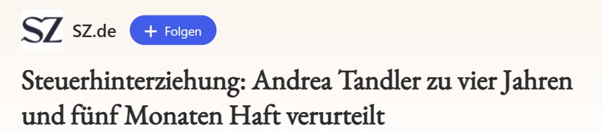 Die Münchner Unternehmerin und CSU-Politikertochter Andrea Tandler ist wegen millionenschwerer Steuerhinterziehung in zwei Fällen zu vier Jahren und fünf Monaten Haft verurteilt worden. Das Urteil erging am Freitagmorgen nach einem gut zweimonatigen Prozess am Landgericht München I. In ihrer Begründung sagte die Vorsitzende Richterin Andrea Wagner, dass die Beweisaufnahme "erdrückend und eindeutig" gewesen sei. Tandler und ihrem mitangeklagten Weggefährten Darius N. sei es darum gegangen, durch illegale Konstrukte ihre Steuerlast in Folge eines "exorbitanten Geldsegens zu drücken und zu vermeiden"