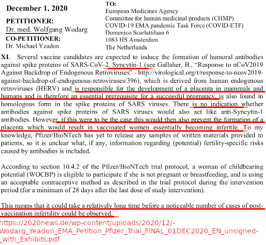 Es gibt noch das lange bekannte Syncytin-Thema, das spielt aber nur bei geimpften Müttern eine Rolle. Bei deren Töchtern (falls diese das Spike produzieren sollten, weil die Produktion inzwischen im Erbgut festgeschrieben ist) wohl nicht, da das Immunsystem die dann als eigene/nicht-fremde Proteine erkennen sollte. oder doch?