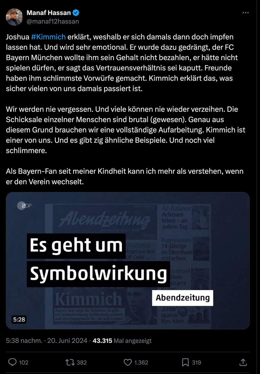 Manaf Hassan (@manaf12hassan) auf XJoshua #Kimmich erklärt, weshalb er sich damals dann doch impfen lassen hat. Und wird sehr emotional. Er wurde dazu gedrängt, der FC Bayern München wollte ihm…x.com -