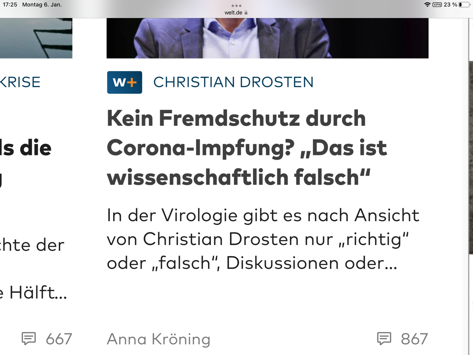Der Virologe Christian Drosten hält an der Wirksamkeit des Fremdschutzes der Corona-Impfung und der Empfehlung zu einer allgemeinen Impfpflicht fest. Dies sagte der Institutsdirektor für Virologie an der Berliner Charité in einem mehr als dreistündigen Gespräch für den Podcast „Jung und naiv“.