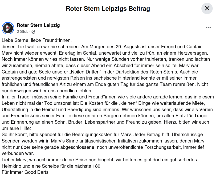 Dem Foto nach keine 30, wird ein Herzversagen nachdem man wenige Stunden vorher trank und lachte, beim linken Fußballverein (große Verfechter aller Coronamaßnahmen) als gottgegeben hingenommen und keinerlei Fragen gestellt.
