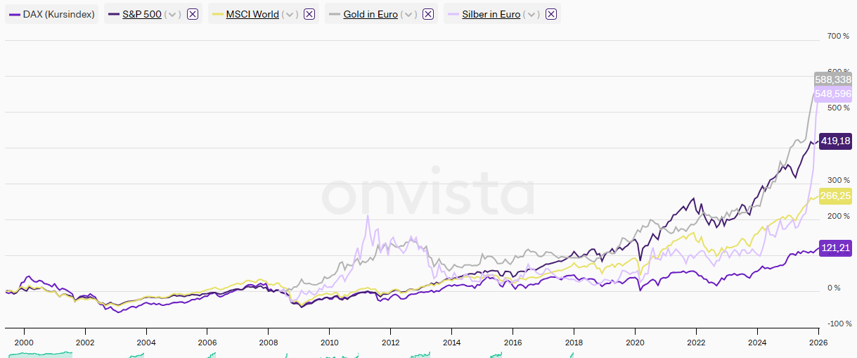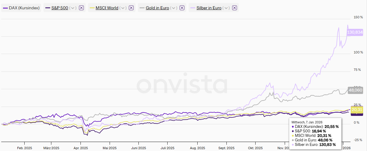 ... und nochmal der gleiche Chart ergänzt um Silber und Gold jeweils auch in EUR...