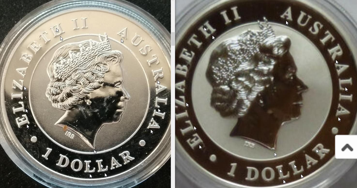 hallo, ich habe vor kurzem ein paar silbermünzen gekauft unter welchen mir beim kookaburra etwas aufgefallen ist, und zwar ist beim ,,inneren,, ring welcher ja leicht angerauht ist das finish etwas unbeständig und die angerauhte fläche schliesst nicht ganz mit der abgrenzung ab. könnte es sich hierbei um ein fake handeln oder gibt es da fertigungsbedingt toleranzen? leider konnte ich bis jetzt kein einziges exemplar per bildersuche o.ä. finden welches dieses manko aufweist..