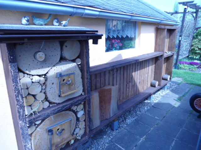Ich wollte hier nochmal ein Update posten was so passiert ist seitdem ich mein Bienenhotel aufgestellt habe. Es zeigt nach Osten da es hier geschützt an der Wand von Nachbars Scheune steht. Nicht optimal aber würde ich es nach Süden ausrichten würde es ungeschützt im Regen stehen und ich auf die Rückwand sehen wenn ich in den Garten gehe. Ästhetisch nicht gerade schön. Es steht jetzt genau zwei Wochen und 27 Wohnungen sind bezogen und von den Bienen von außen verschlossen. Heißt da liegt die neue Brut drin. Beliebt sind vorallem links unten, rechts unten, links außen der Stamm und rechts oben wo die Blende mit den sechs Löchern davor ist. Dahinter befinden sich mehrere Holzstücke mit Brutlöchern. Ich kann aber hier nicht sehen wieviele bezogen sind da die Blende davor ist. Sporadisch füllen sich queerbet die Löcher. Fächer die nicht funktionieren werde ich evtl. austauschen. Der grüne Altbau rechts außen ist auch bezogen und etliche Röhrchen sind zu habe sie aber nicht gezählt. Zum Abschluss noch ein paar Bilder von vorgestern. Heute und gestern keine Aktivität. Es regnet und hat abgekühlt. Bis zum nächsten Update und immer dran denken: Wenn du es baust werden sie kommen.