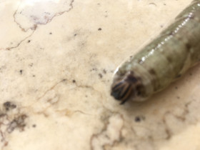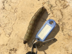 • Da sehe ich doch vorhin an einer Pinie einen Riesenkrabbler, ca 3cm lang. Durchsichtige Flügel, perfekte Tarnung