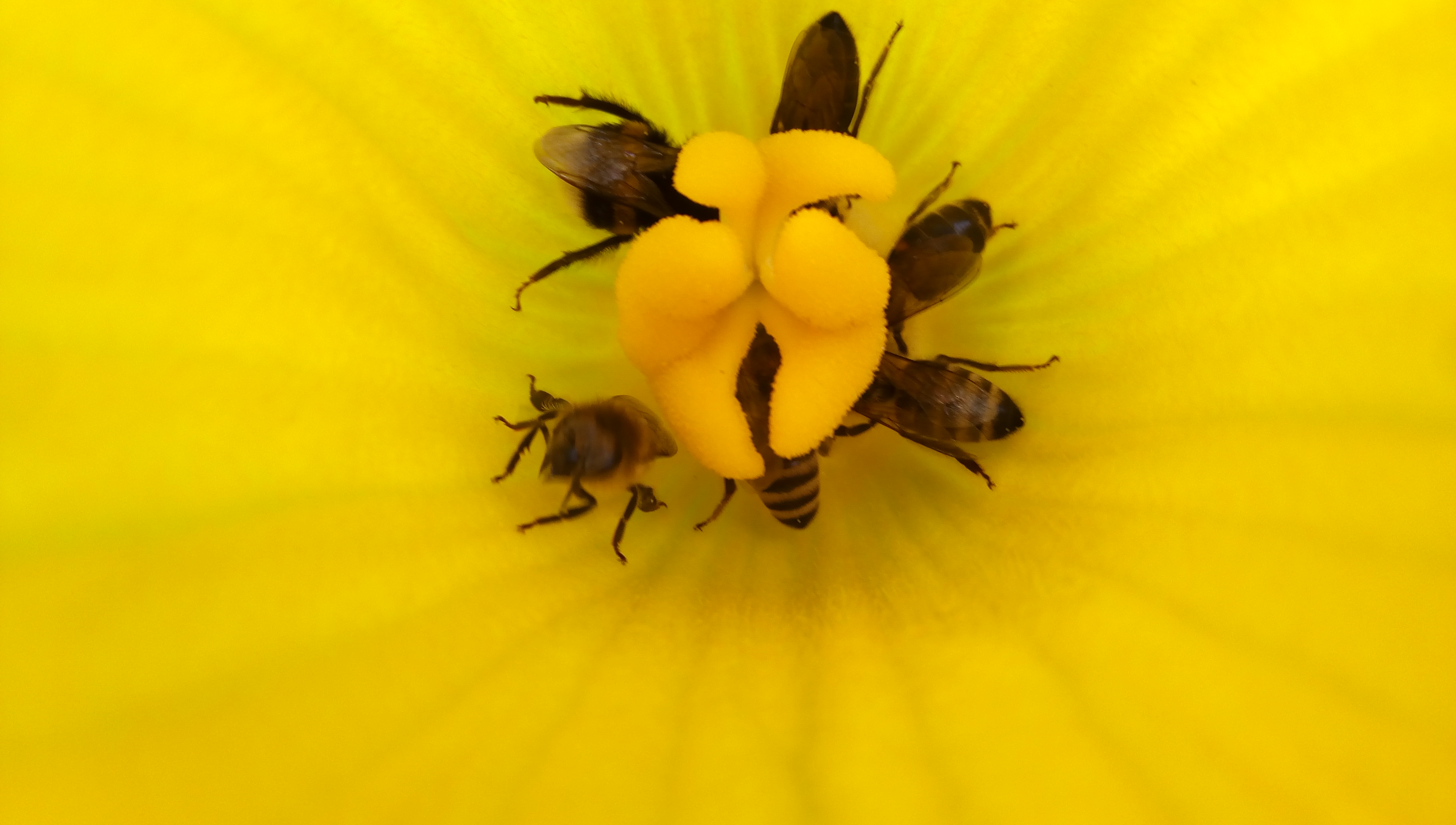 Kürbisblüten gefallen ihnen sehr. Bin gerade im Garten. Reihenfolge der Bilder stimmt nicht. Mein Kürbis wie ihr seht. In den Blüten sitzen etliche Bienen.