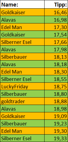 - Gewinner unseres Spieles wird der Silberspieler sein, dessen Tipp zum letzen Handelstag des Spielmonats, dem tatsächlichen Silberkurs zu diesem Zeitpunkt am besten entspricht. Es gilt der Globex-Schlusskurs NY in US-$ 22:30 MEZ.