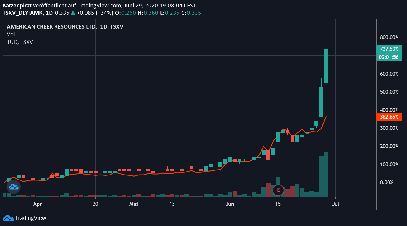• American Creek hat seinen JV-Partner Tudor in den letzten zwei Tagen zerlegt wie die Gegenüberstellung im Chart zeigt. Heute plus weitere 30 %. Langsam wird der brutale Hebel von AMK unheimlich. Für mich beinahe ein Verdreifachung in 10 Tagen. :rolleyes: