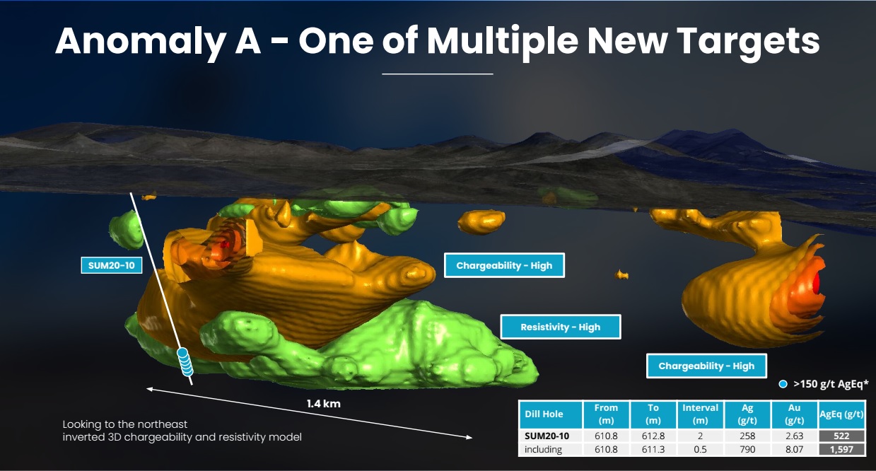 155 g/t silver equivalent (79 g/t Ag and 0.76 g/t Au) over 15.1 m from 397.4 m in SUM21-32