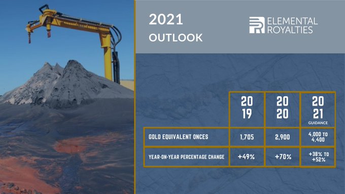 Elemental maintains guidance of 4,000 to 4,400 attributable zero-cost gold equivalent ounces1 in 2021 from its existing portfolio, weighted towards the second half of the year, with over 90% of expected revenue derived from gold. -