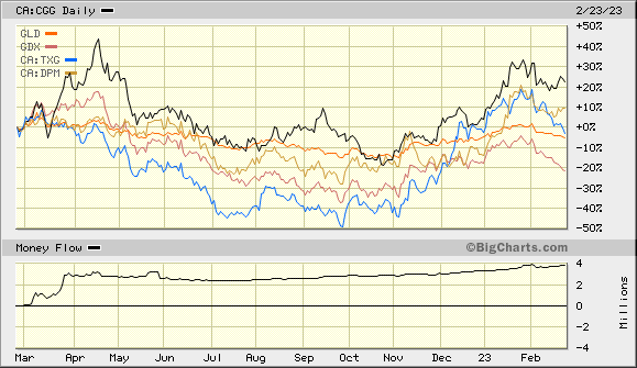 Angehängt ein Vergleich zu den Indices COPX und URA -- mit deren starkem Lauf -- sowie GDX; CGG ist eine Gold / Kupferaktie...