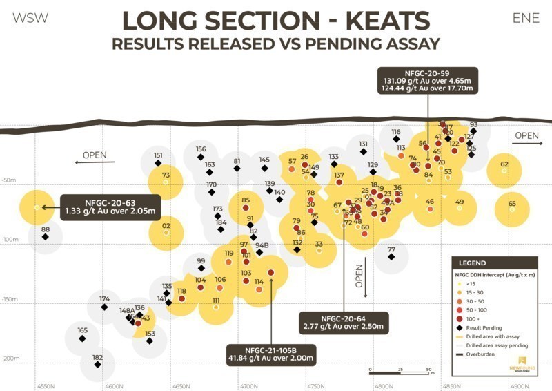 -- Der Abschnitt von 61,8 g/t Au auf 13,7 m in NFGC-21-118 ist ein 21 m tiefer gelegener Step-Out in Richtung Süden vom zuvor am weitesten südlich gelegenen Abschnitt von 29,1 g/t Au auf 11,4 m in Bohrloch NFGC-21-104 (siehe NFG-Pressemitteilung vom 1. März 2021) und ist der tiefste Abschnitt, der bisher bei Keats gebohrt wurde.