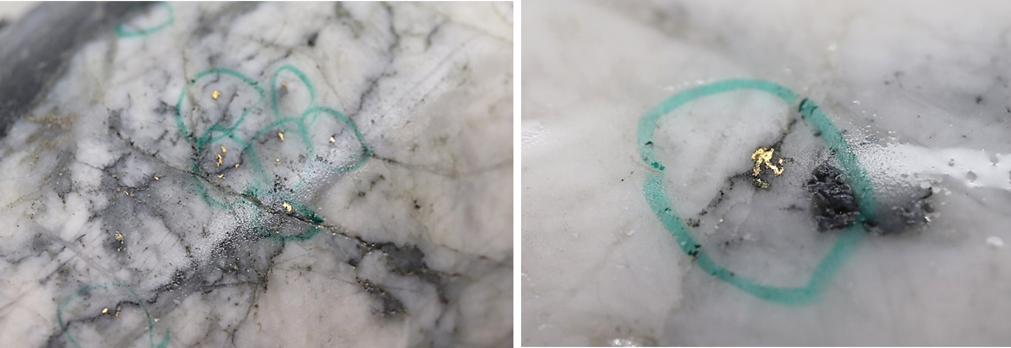 Figure 1: Photos of mineralization from: Left: at ~75m in NFGC-23-1120, Right: at ~64m in NFGC-23-1120, Bottom: at ~72.5m - 94m in NFGC-23-1120. ^Note that these photos are not intended to be representative of gold mineralization in NFGC-23-1120. (Photo: Business Wire)[Blockierte Grafik: https://newfoundgold.ca/wp-content/uploads/2023/03/1.png]