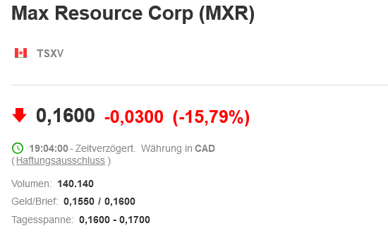 Vielmehr ist es das aktuelle negative Sentiment, wo die ganze Miner-Branche kurstechnisch eher in einem Down-Trend ist. Zudem ist Max Resource ein early Earlier, welcher sich noch in der Prospektionsphase befindet. Dazu kommen noch die viele Millionen Warrants, welche im August 2021 auslaufen und zu 0.14 CAD gewandelt werden können. Und per Ende 2021 gibt es noch einmal mehr als 3m Warrants zu 0.10 CAD.
