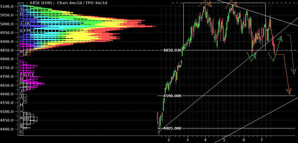 Die Korrektur bei den Standardwerten hat bisher nichts gebracht, außer daß ich noch gut aus meinen Shorts herausgekommen bin. Nach oben sollte der SX5E spätestens bei 4.850 "zu" sein; ich schätze aber daß das zweite Abwärtsbein schon früher kommt. Ein erneutes Anlaufen der Montagstiefs bei 4.400 wäre der frühestmögliche Abschluß der Korrektur. Ich kann mir aber auch vorstellen, daß noch einmal die gleiche Länge des Abwärtsweges bis zur runden 4.000er-Marke absolviert wird.