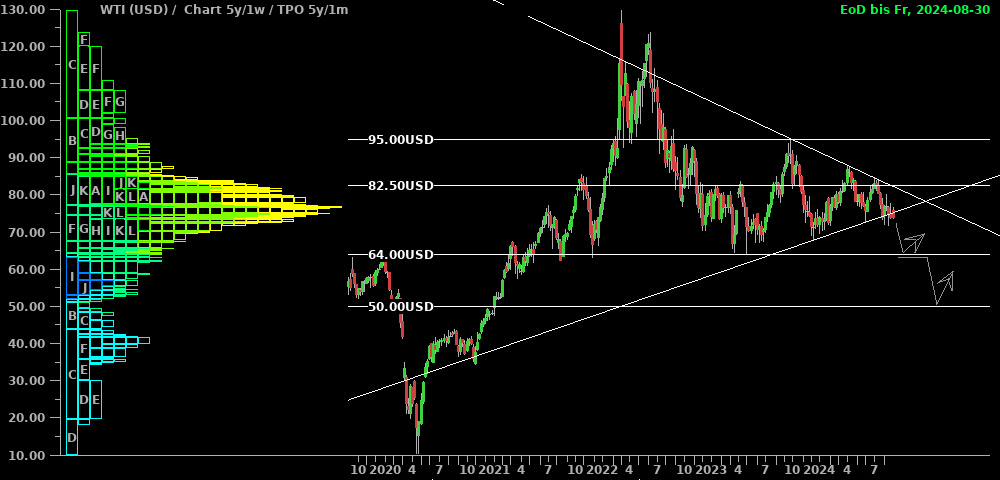 Öl ist im Wochenverlauf aus dem Dreieck nach unten ausgebrochen und konnte sich nur haarscharf zum Freitagsschluß wieder hineinretten. Ich bleibe für Öl und Erdgas bärisch und warte mit einem weiteren Positionsaufbau ab, bis die $64 oder besser noch $50 erreicht werden. Nach meinem Dafürhalten preist der Ölmarkt korrekterweise eine Rezession ein und zeigt damit gleichzeitig die Absurdität der Bewertungen im Standardwertebereich.