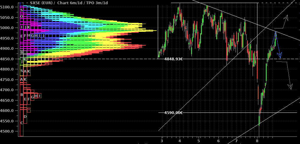 Die Korrektur bei den Standardwerten hat bisher nichts gebracht, außer daß ich noch gut aus meinen Shorts herausgekommen bin. Nach oben sollte der SX5E spätestens bei 4.850 "zu" sein; ich schätze aber daß das zweite Abwärtsbein schon früher kommt. Ein erneutes Anlaufen der Montagstiefs bei 4.400 wäre der frühestmögliche Abschluß der Korrektur. Ich kann mir aber auch vorstellen, daß noch einmal die gleiche Länge des Abwärtsweges bis zur runden 4.000er-Marke absolviert wird.