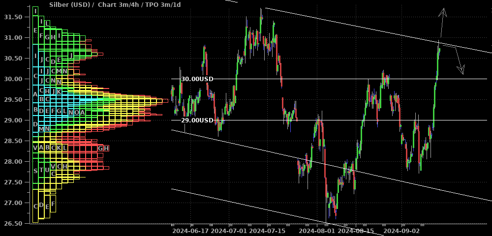 Im Silber zeigen die letzten Tageskerzen noch Unsicherheit bzw. wenig Überzeugung an, aber charttechnisch ist Silber aus dem Abwärtskanal nach oben ausgebrochen.