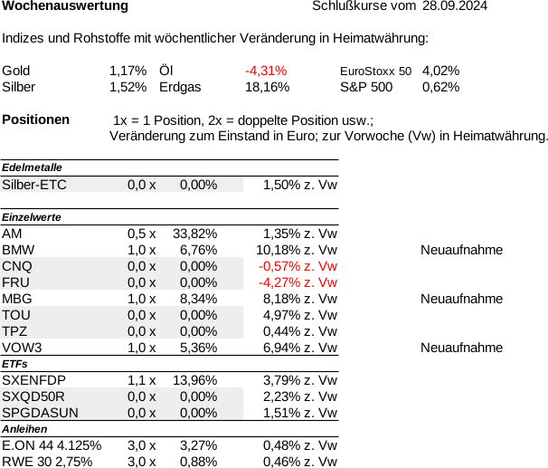 Mit neuen Investitionen werde ich mich in den nächsten Wochen zurückhalten wegen der Situation im Nahen Osten und der Wahlen in den USA. Kleine Positionsaufbauten sind bei passenden Kursen möglich; zusätzlich zu den o.g. Werten beobachte ich momentan auch noch DHL und RWE.