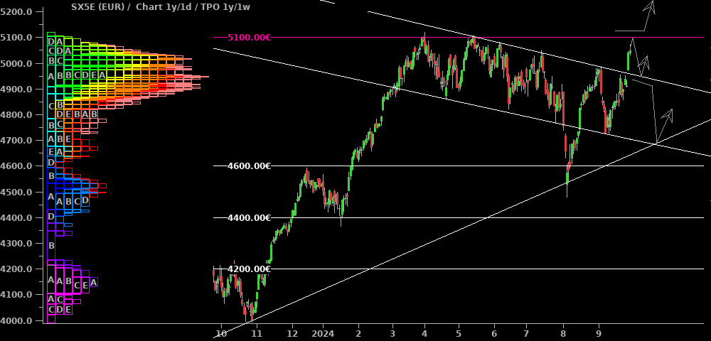 Der SX5E ist nun auch aus seinem Abwärtstrendkanal ausgebrochen und es fehlt nur noch der Sprung über die 5.100, um dem DAX zu neuen Allzeithochs zu folgen. Die Erwartung, daß es nach der ersten Zinssenkung in den USA zu einer schärferen Korrektur kommt, kann man, denke ich, mittlerweile abschreiben. Es ist gut möglich, daß der Markt jetzt bereits die Jahresendrally vorwegnimmt und bis zum Jahresende fest bleibt.