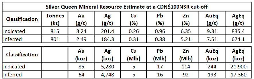 Ihr Flaggschiff ist das Silver Queen Au-Ag Projekt in B.C. In den letzten 50 Jahren wurden dort durch verschiedene Gesellschaften bereits über 50'000 m gedrillt, aber nur 3'000 Oz Gold und 400 Toz Oz Silber gefördert. Inzwischen sind die Resourcen I+I auf 437 Toz Oz AuEq bzw. 39 Moz AgEq angewachsen. Cu, Pb, Zn ist mit dabei. Insgesamt hochgradig mit 9.3 g/t AuEq oder 835 g/t AgEq für die Resourcen Indicated.