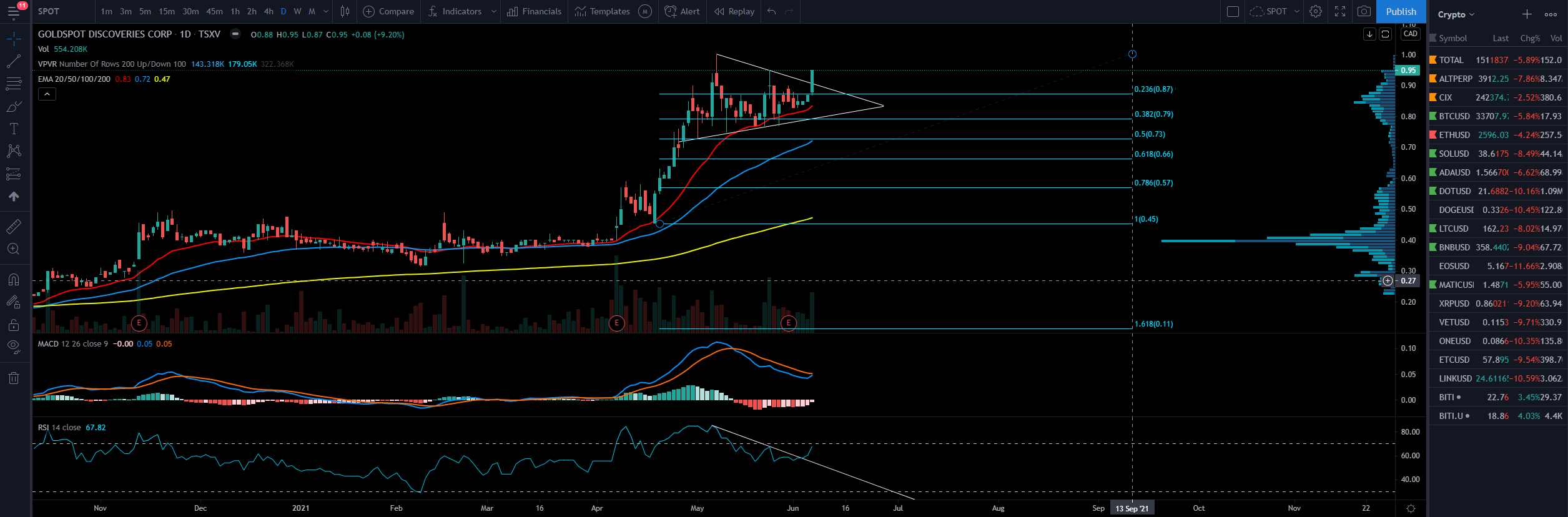 - GoldSpot holds 1,689,700 shares of New Found Gold, representing 1.2% of the New Found's issued shares, with a market value of $20.2 million as of June 2, 2021.