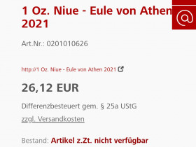 1 Oz. Niue - Eule von Athen 2021 für 26,12€ beim Edelmetallhändler Göbel erhältlich.